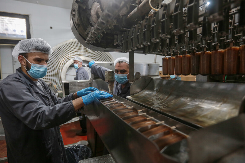 Palestinian employees produce frozen treats at a factory in Gaza City on 21 May.