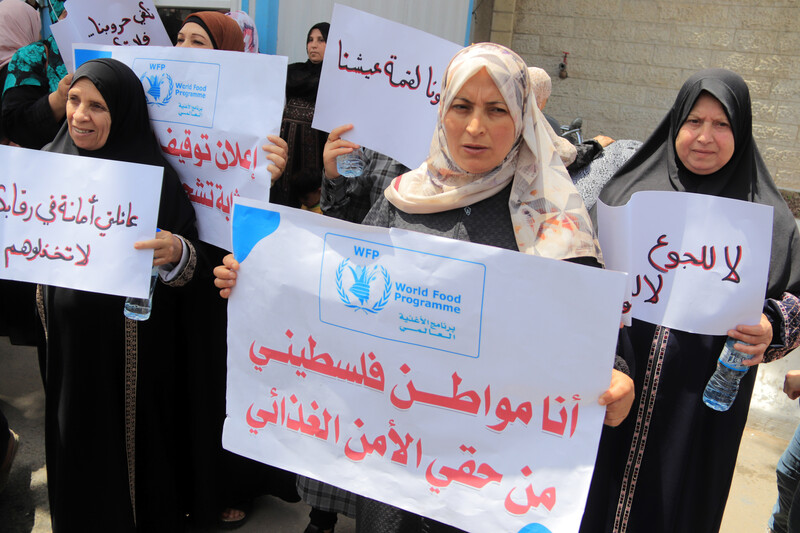 Palestinians protest against the stopping of food aid in front of the United Nations Development Programme office in Gaza City on 21 May. The World Food Programme is suspending aid to more than 200,000 Palestinians beginning in June due to what it said was a severe shortage of funds.