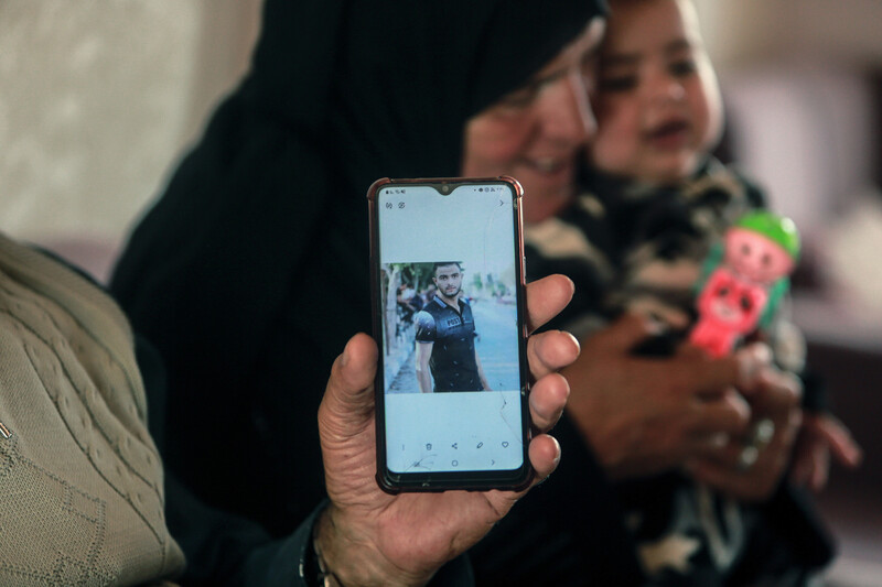 The family of 23-year-old Muhammad Yousif Abu Taima, killed in an Israeli airstrike earlier in the month, at their home in Khan Younis, southern Gaza Strip, 22 May.