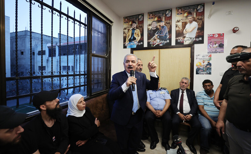 Palestinian Authority Prime Minister Mohammad Shtayyeh offers condolences to the families of Palestinians killed by Israeli forces in the Balata refugee camp in the northern West Bank city of Nablus, 24 May.