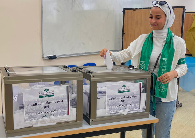 Palestinian students cast their votes in the student council elections at Birzeit University on the outskirts of the West Bank city of Ramallah, 24 May. The student council elections at Palestinian universities are seen as a barometer of Palestinian public opinion. The Hamas-affiliated Islamist bloc won the largest share of representation at the student council at Birzeit University, beating the Fatah-affiliated list by two seats.