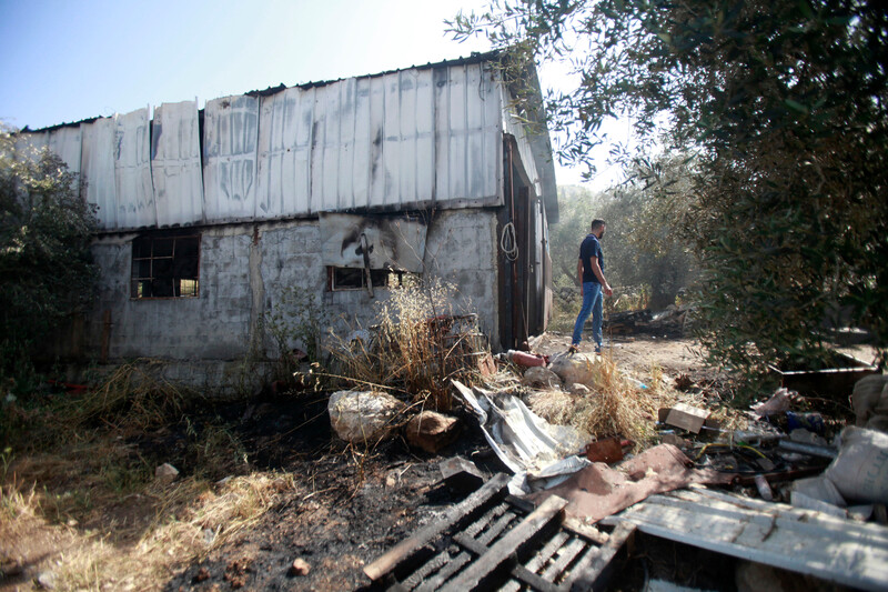 Palestinians inspect the damage following a rampage by Israeli settlers in Burqa, near the West Bank city of Nablus, 25 May. Ghassan Daghlas, who monitors Israeli settlement activity in the northern West Bank, said that Israeli settlers, under army protection, attacked homes and set a barn and the surrounding olive grove on fire.