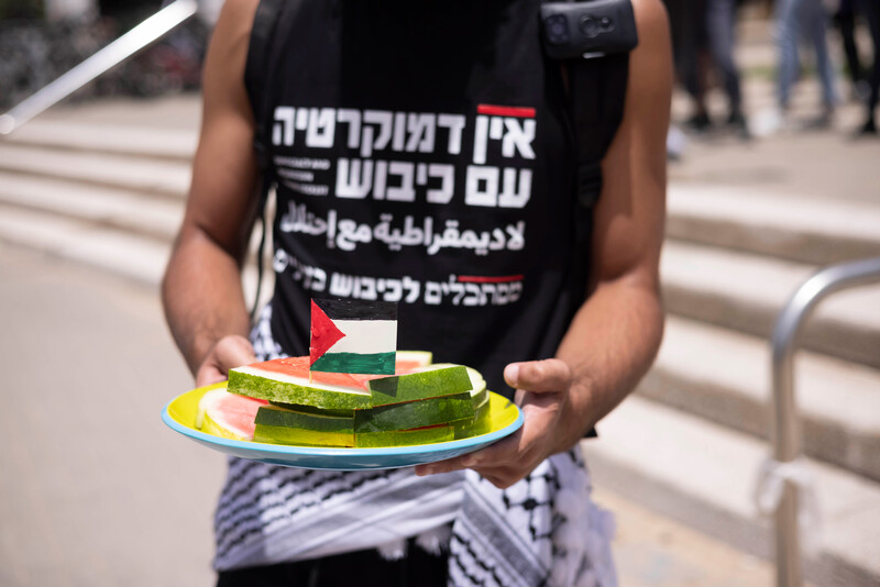 Students at Tel Aviv University protest against a bill that would forbid the raising of Palestinian flags at Israeli universities, 28 May. Watermelons, bearing the same colors as the flag of Palestine, became a symbol of Palestinian nationalism during past periods in which display of the flag was banned by Israel.