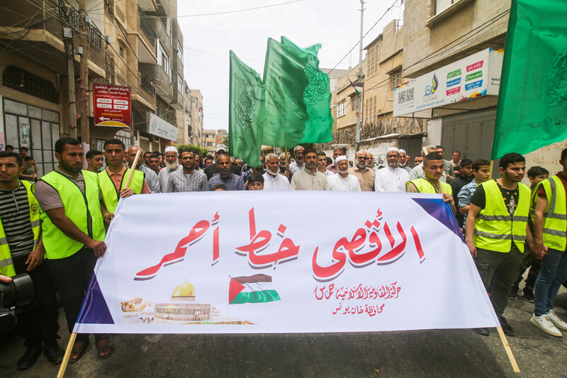 Palestinians in Khan Younis, southern Gaza Strip, show their support for al-Aqsa mosque on 26 May. The banner reads: “Al-Aqsa is a red line,” a position held by Hamas, which refrained from responding militarily to Israel’s assassination of Islamic Jihad leaders in Gaza earlier in the month.
