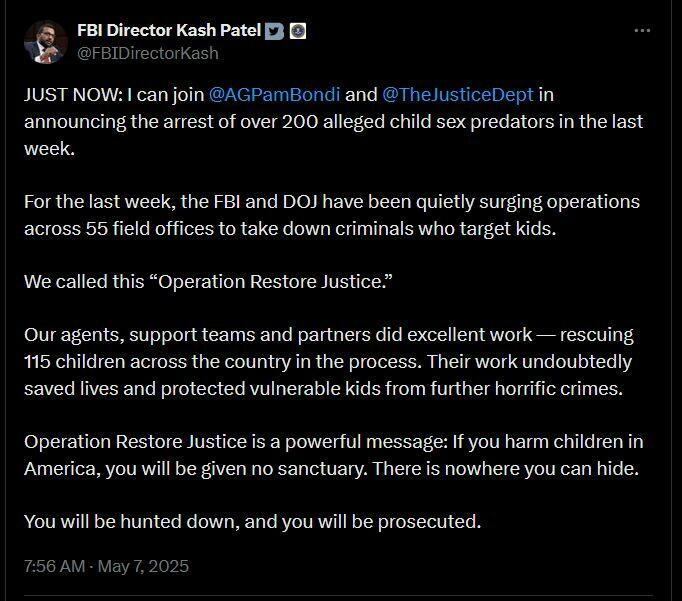 During the same presser, FBI Director Kash Patel announced that over 200 alleged child sex predators were arrested as part of Operation Restore Justice.