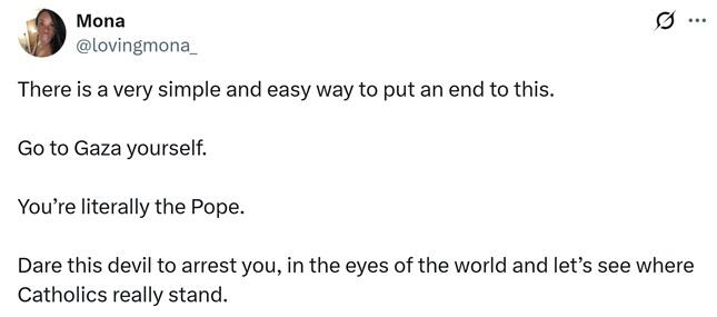 "Get in a plane with humanitarian aid, break the aerial siege," another user wrote. "Would they down your airplane? The Pope’s plane?"I would love to see Pope Leo *lead* a delegation to Gaza and bring medical supplies and food/water to people who are literally in the last deadly stages of famine.