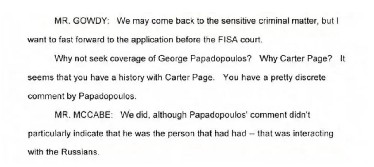 Downer also said he “did not get the sense Papadopoulos was the middle-man to coordinate with the Russians.” More infuriating? The FBI dropped Papadopoulos as a lead weeks into the Crossfire Hurricane inquiry, with Deputy Director Alexander McCabe testifying that his comments “didn’t particularly indicate” contact with Russians: