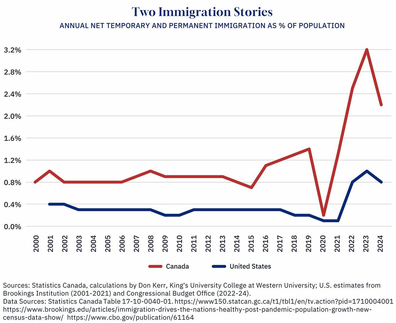 A 2019 Gallup survey found that Canada had the world’s most welcoming and positive attitude toward immigrants. In the U.S., the survey found support for immigration declined with age; in Canada, Gallup found no differences by age group. The most pro-immigration Americans were those in their teens and twenties, but even they were not as pro-immigration as Canadian seniors.