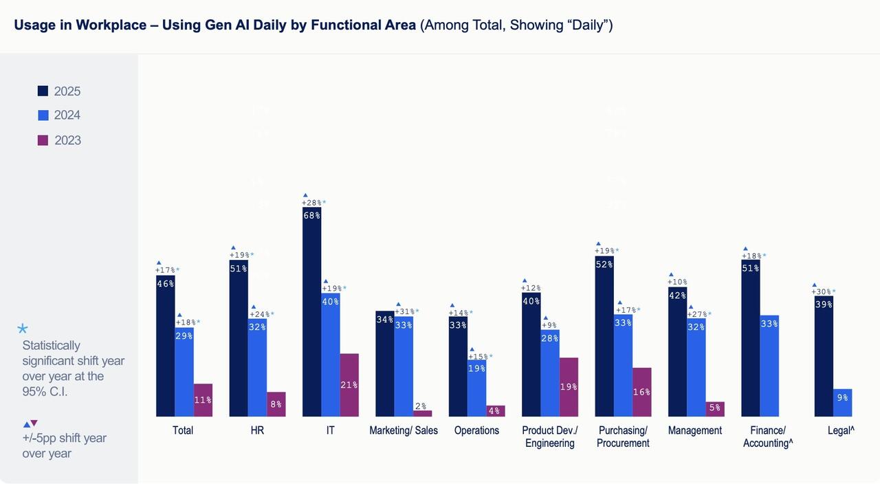 As you can see, fully 68% of IT workers are using AI on a daily basis, up from 21% in 2023. And 39% of legal workers are now using AI every day, up from just 9% last year.